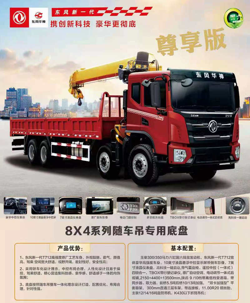 底盤(pán)配置:玉柴300/350馬力六缸國(guó)六排放發(fā)動(dòng)機(jī),東風(fēng)新一代T712寬體豪華高強(qiáng)度車(chē)身,10英寸液晶懸浮中控顯示屏帶倒車(chē)影像,7英寸液晶儀表盤(pán),高科技一鍵啟動(dòng),帶氣囊座椅、遙控中控(一體式)四鎖合一,TBOX帶行駛記錄儀, 原廠自動(dòng)空調(diào),電動(dòng)調(diào)節(jié)一體式后視鏡,2150+4400+13500mm,陜齒 9 /10檔帶高低檔變速箱,帶同步器、取力器,前橋5.5噸后橋10/13噸加強(qiáng),“雙卡加強(qiáng)型”平衡懸架, 300mm直通三層車(chē)架,帶連接板,11.00R20 鋼絲胎,主裝12/14/16噸直臂吊機(jī),K430以下折臂吊機(jī);
